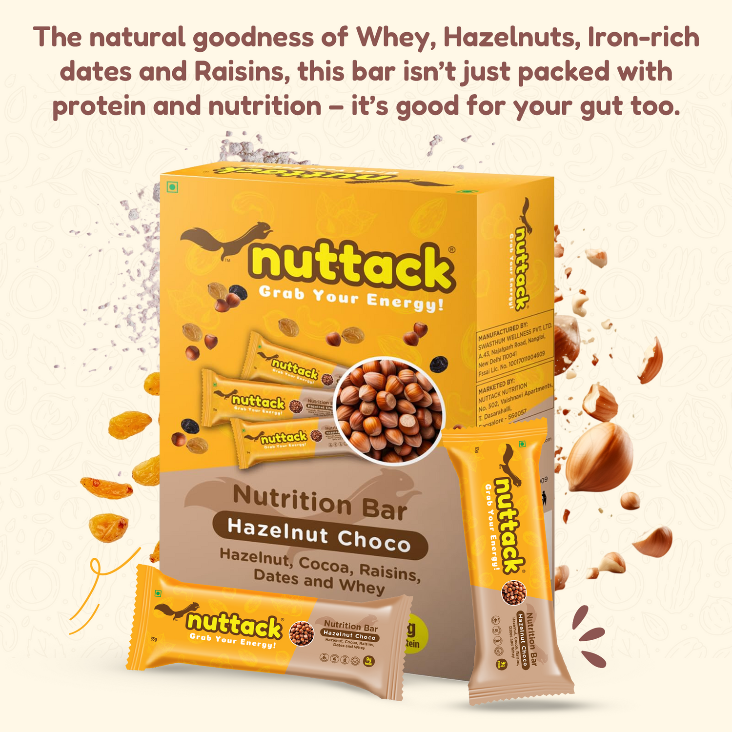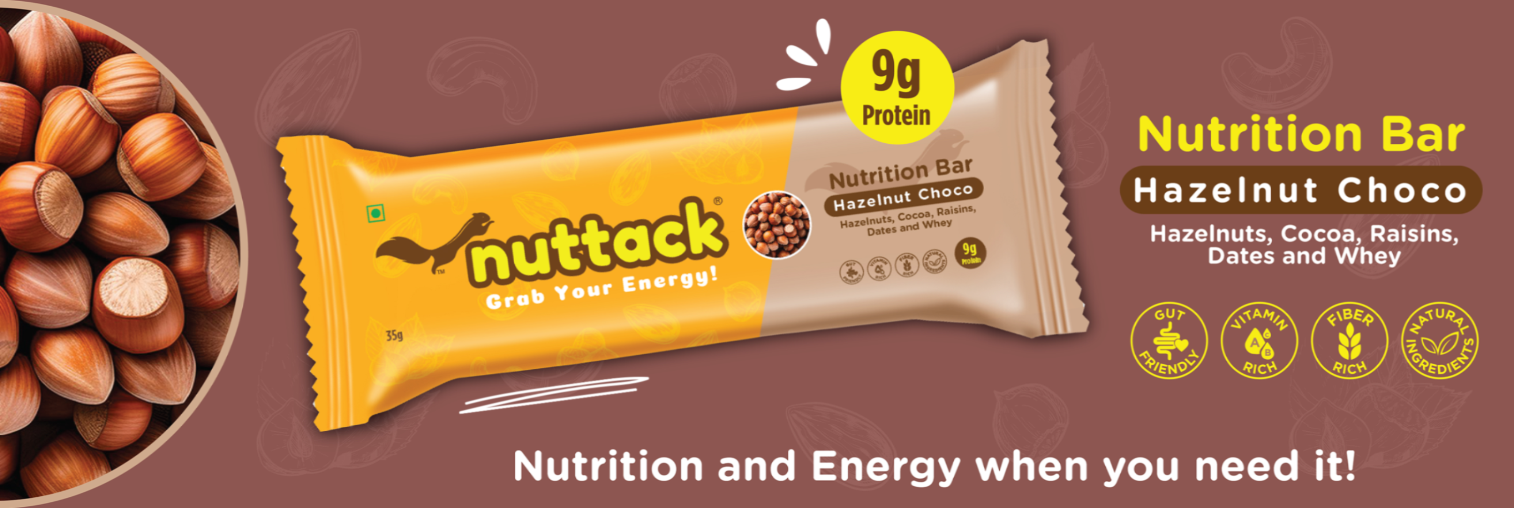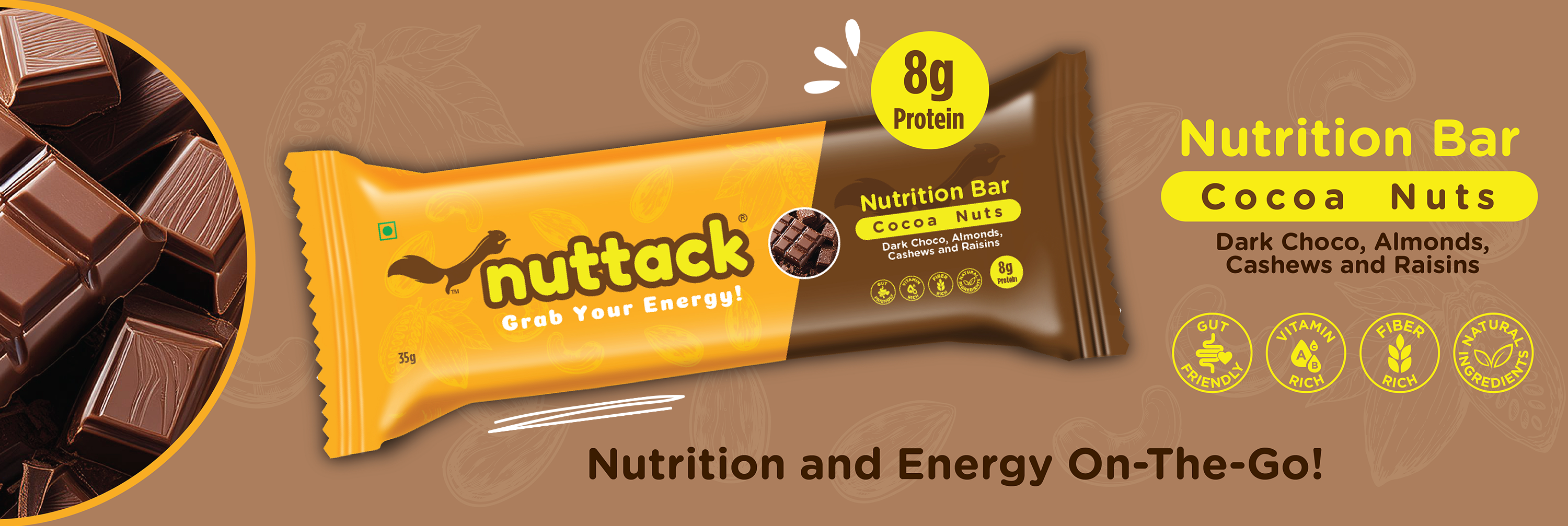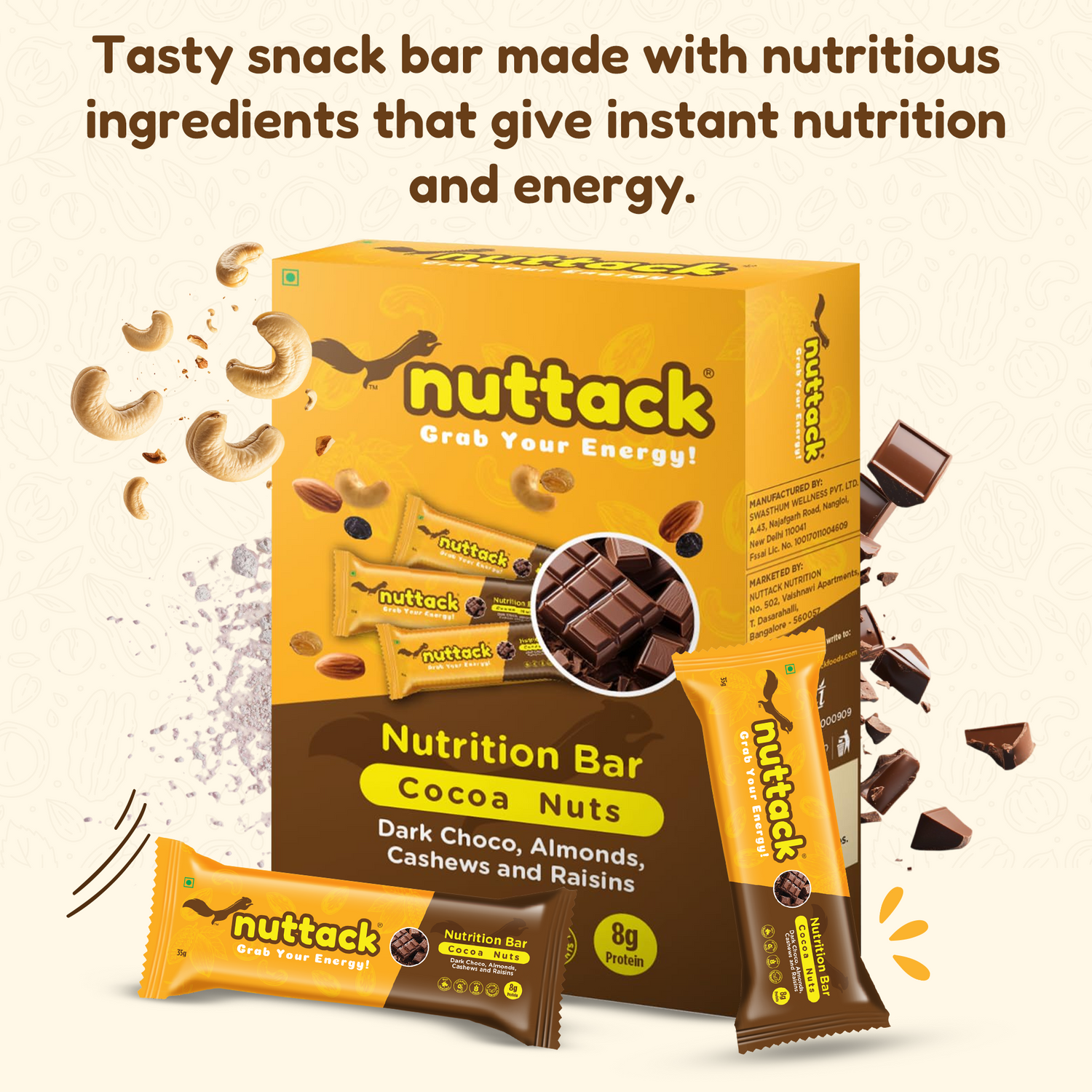 Enriched with Whey and Dark Chocolate, each bar packs in 8 grams of Protein, making it a wholesome blend of Protein, Energy and Nutrition.